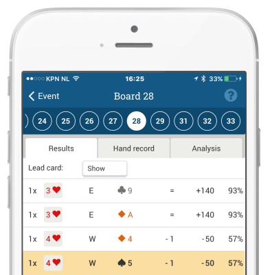 See the scores entered on the Bridgemate live on your smartphone. Lead cards are also displayed, and board percentages are updated continuously.
